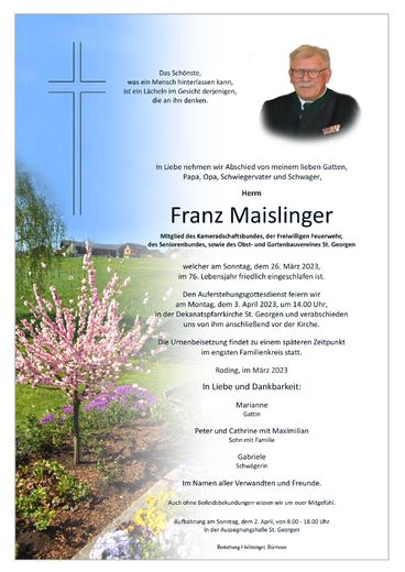 Am 26.März starb unerwartet Schriftführer Franz Maislinger mit 75 Jahren, nachdem er zwei Tage zuvor noch an der Kameradschaftssitzung teilgenommen hatte. Kamerad Maislinger war von 1999 bis 2004 und seit 2014 Schriftführer der Kameradschaft und zwischendurch auch Bezirksschriftführer. Als ehemaliger Gemeindesekretär der Gemeinde St. Georgen war er auch exzellent dafür geeignet. Er war auch beim Begräbnis des Obmann-Stellvertreters von 1992 bis 2002, Kamerad Ludwig Ramböck aus Eching dabei, der am 10.März mit 78 Jahren verstorben war.
